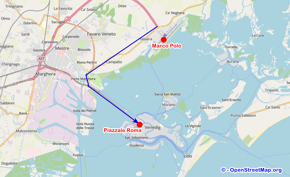 Der internationale Flughafen Marco Polo befindet sich etwa 15 Kilometer vom historischen Zentrum entfernt. Wer dort landet, ist also auf einen Transfer angewiesen – sei es per Bus, Taxi, oder ganz klassisch mit dem Vaporetto, dem venezianischen Wasserbus.
