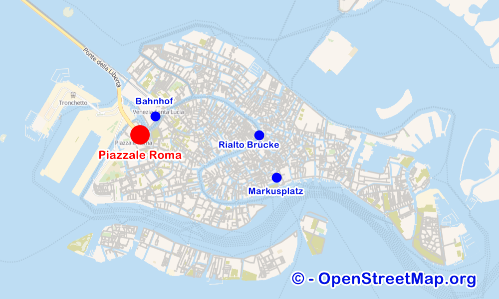 Der Piazzale Roma befindet sich am nördlichen Stadtrand von Venedig und ist einer der wichtigsten Verkehrsknotenpunkte der Stadt. Vom Festland bei Mestre führt die rund 4 km lange und etwa einen Meter hohe Ponte della Libertà direkt zu diesem Platz. Auf der Brücke verlaufen in beide Fahrtrichtungen je zwei Fahrspuren sowie mehrere Bahngleise. Vom Piazzale Roma erreicht man den Markusplatz im Süden der Stadt in etwa 30 Minuten zu Fuß.