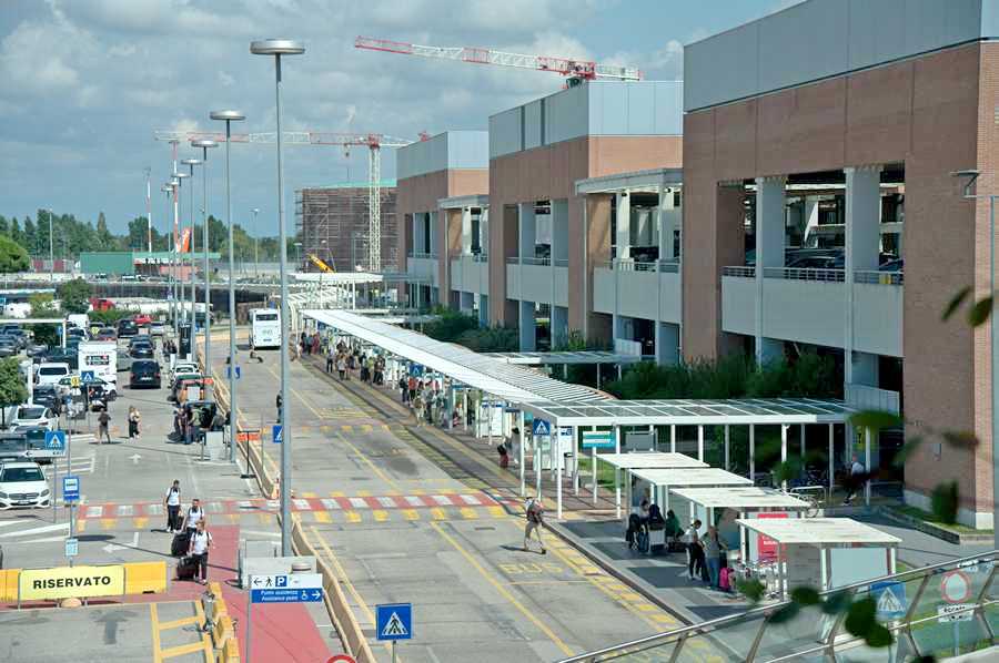 In diesem Übersichtsbild sehen Sie rechts das Flughafen Gebäude Venedig Marco Polo. Sie sehen auch, dass direkt vor dem Ausgang in einer langen Straße, die Haltestellen der Transfer Busse ist.