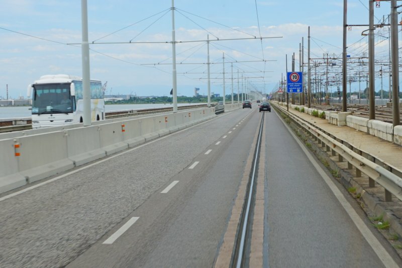 Im Bild die 4 km lange gerade Brücke: Ponte della Liberta. Sie ist die einzige Zufahrt nach Venedig. Deshalb nutzt sie auch der ATVO.