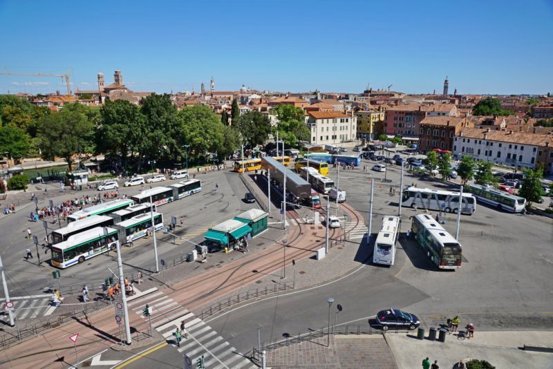 Venedig ist eien Insel, die im Norden der Adria-Lagune liegt. Das gesamte Stadtgebiet ist autofrei. Alle Besucher die mit dem Auto nach Venedig fahren, kommen über eine 4 km lange und 1 Meter hohe Brücke Ponte della Liberta nur bis zu dem Parkhäusern an nördlchen Satdtrand, dem Piazzale Roma. Dort müssen auch die Busse des ATVO halten und wieder zurück fahren. Rechts im Bild, also mitten auf dem Platz, sehen Sie die weißen Busse des ATVO.