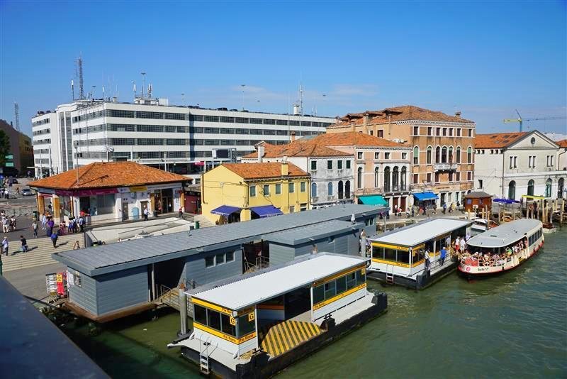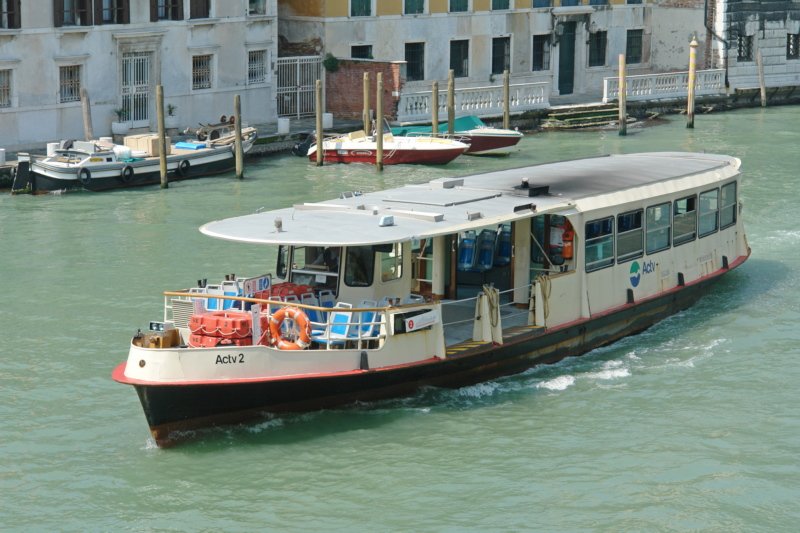 Die meisten Besucher von Venedig werden wohl am Piazzale Roma in einen Wasserbus (Vaporetto) hier im Bild an der Haltestelle Piazzale Roma, umsteigen. Diese Vaporetti werden vom öffentlichen Nahverkehr in Venedig: dem ACTV betrieben. Die Ticktes des ATVO von Treviso nach Venedig haben KEINE Gültigkeit für den öffentlichen Nahverkehr in Venedig. Sie müssen extra bezahlt werden. Die ACTV Linie 1 oder Linie 2 fahren durch den gesamten Kanal Grande, also mitten durch das Stadtgebiet und bieten sich deshalb für die Weiterfahrt an.